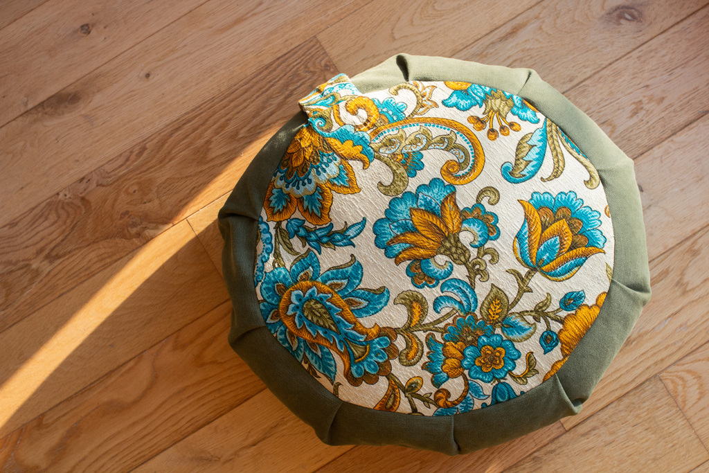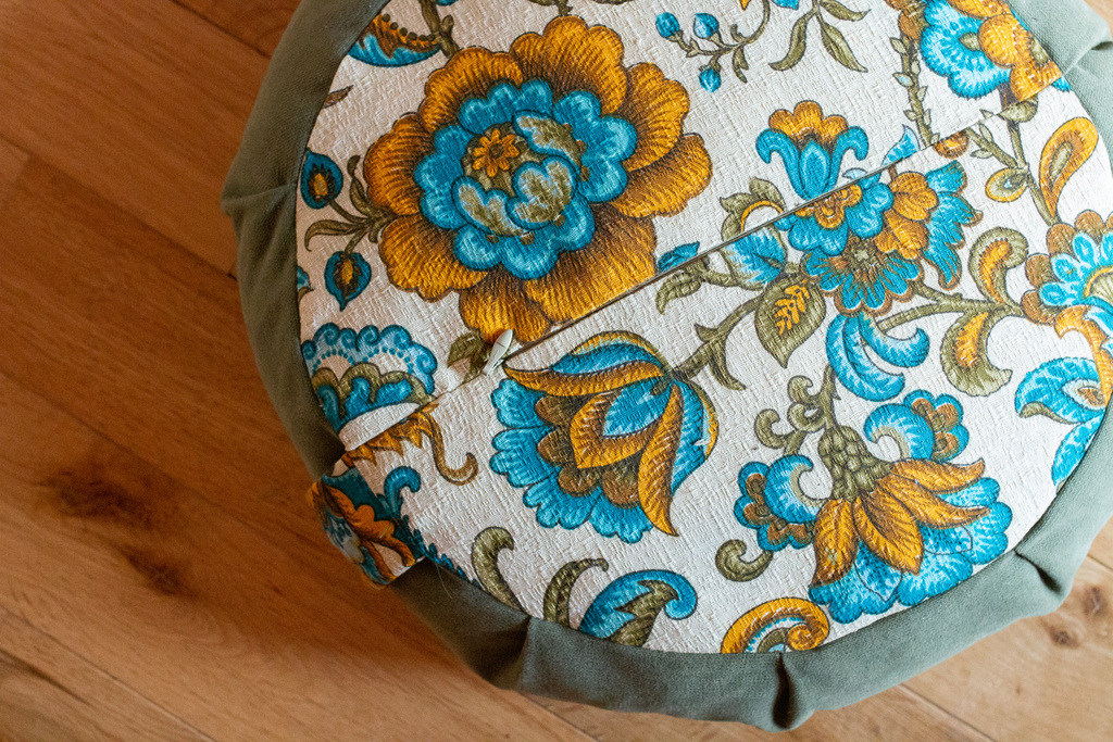 J’ai répondu à une demande de coussin de yoga/méditation, ou zafu. J’ai réalisé un prototype à l’aide des tissus que je récupère (dons, chutes de tissus liées à la confection ou à la retouche de vêtements ou d’ameublement – rideaux, coussins, etc.) et qui habitent les étagères de mon atelier-caravane.