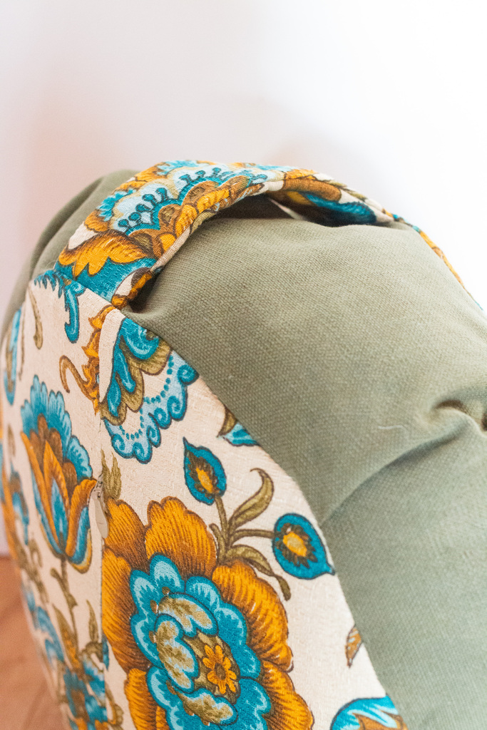 Tissu vert kaki : coupon issu de la confection d’une housse de canapé + Tissu à motifs floraux : coupon récupéré dans les trésors d’une ancienne couturière
